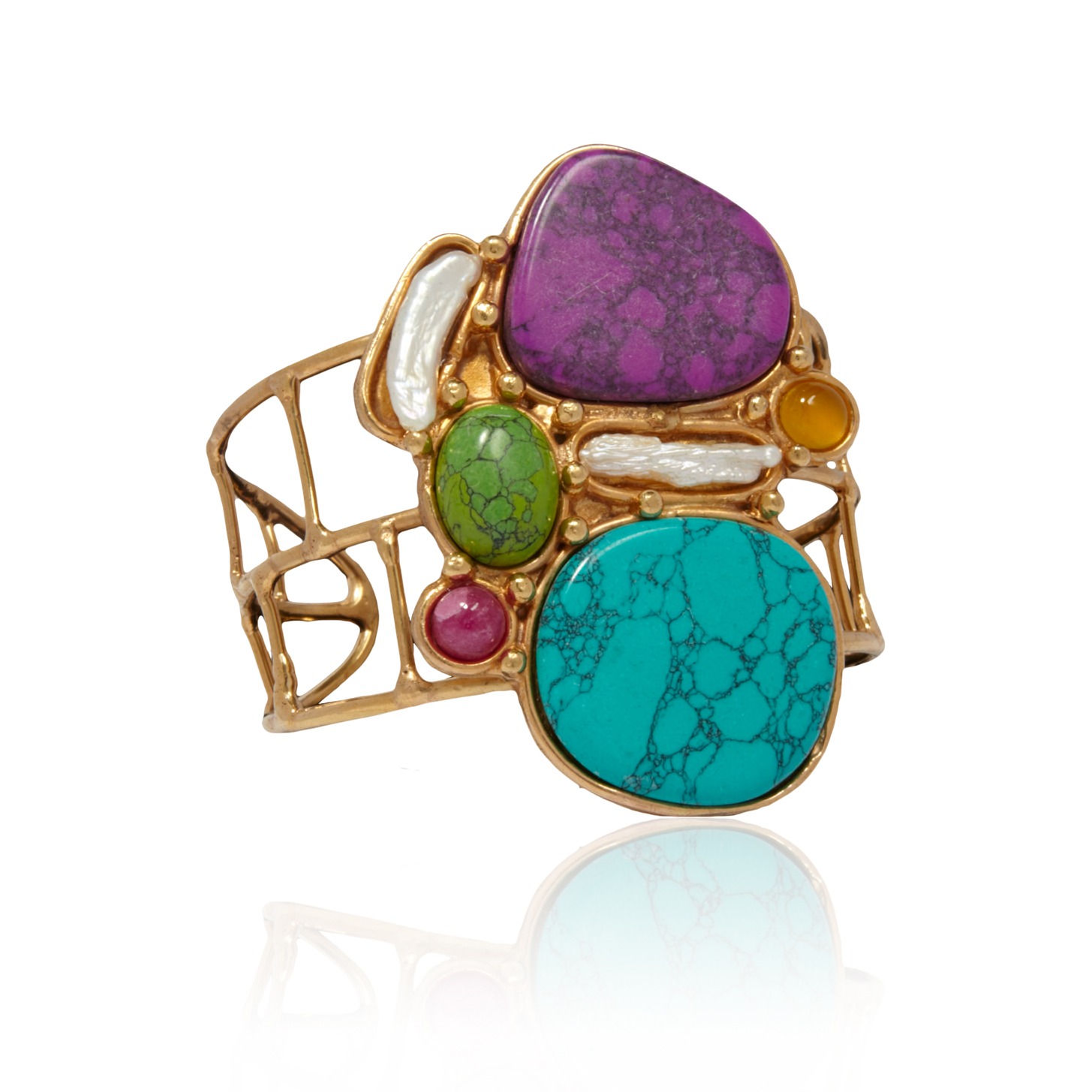 Cuff Composition Abstraite Gold Plated Brass and Turquoise, Green Turquoise, Jaspe Mauve