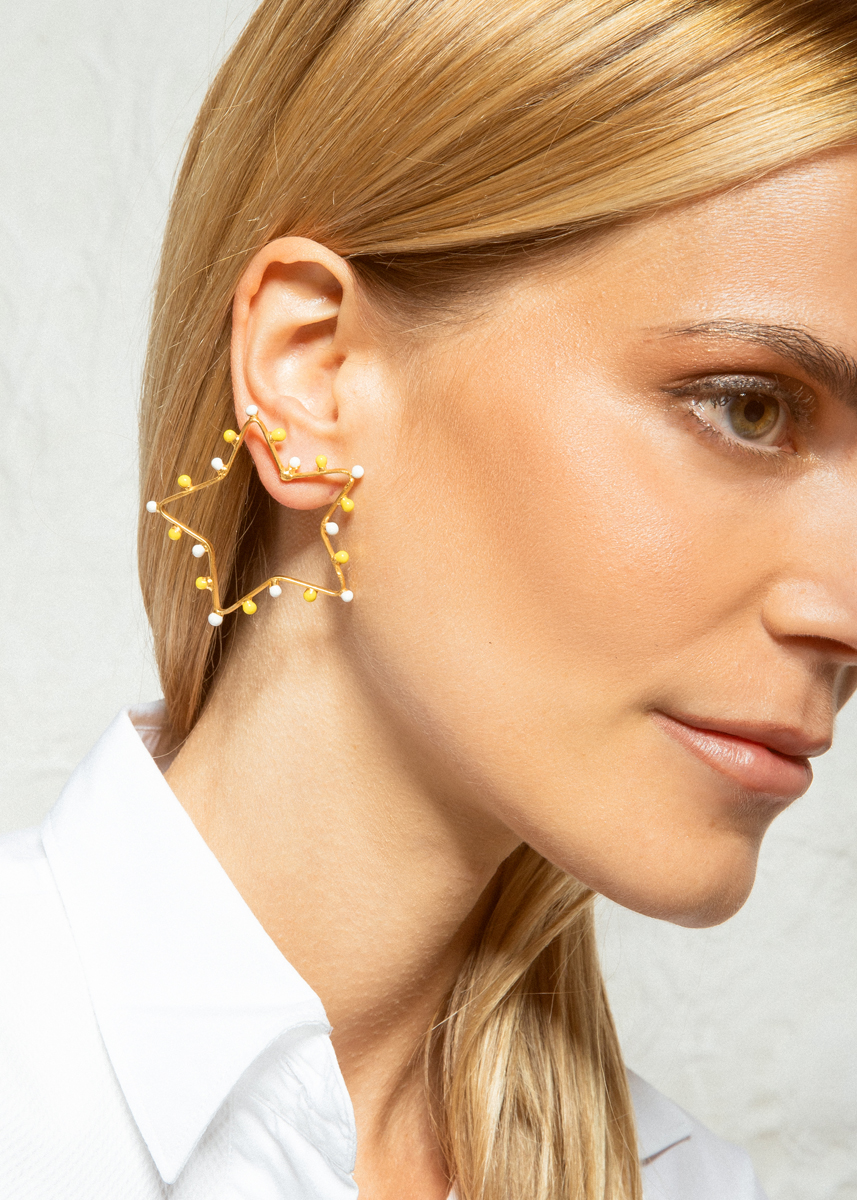 Boucles d’oreille/ Earrings: « Dots » – Pierre/Stone: Etoile Gold – Enamel White / Yellow