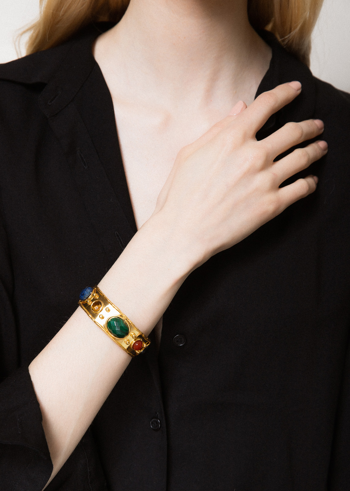 Laiton doré à l’or fin – Malachite, Cornaline, Lapis, Œil de Tigre, Onyx Noire