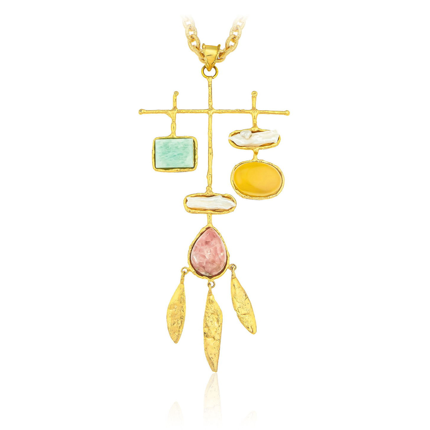 Laiton doré à l’or fin – Amazonite, Perle, Rhodochrosite, Onyx Jaune