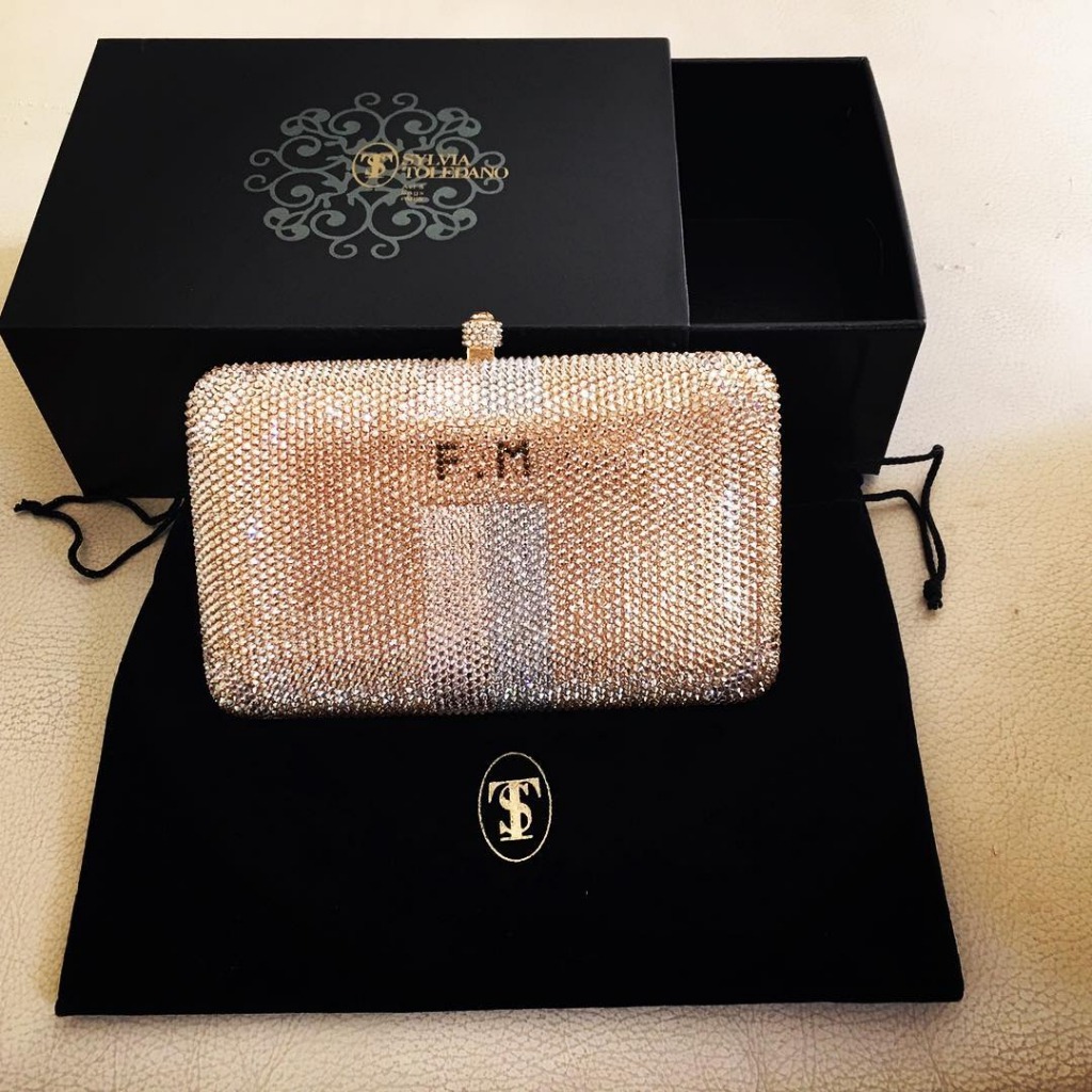 Minaudière en Métal pavée à la main de Cristaux Swarovski. Intérieur or ou argent. Chaîne ammovible. Stylo Pavé Assorti. L’ensemble est présenté dans une boîte écrin contenant une housse de protection.